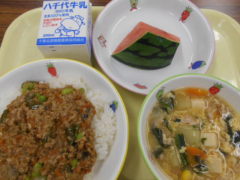 なす入り肉みそ丼(ごはん) ポテトと卵のスープ すいか 牛乳