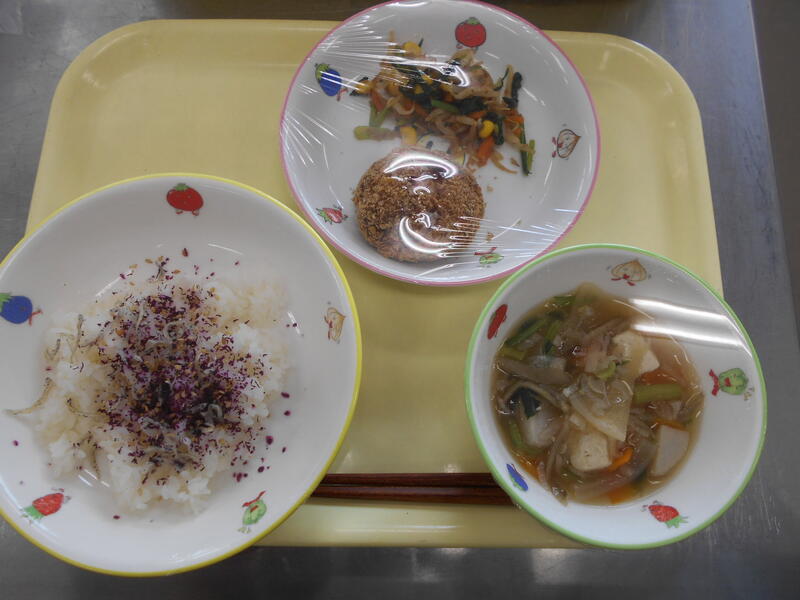 ごはん(ゆかりしらすふりかけ) いわしのメンチカツ風 おかかコーン和え 田舎汁 牛乳