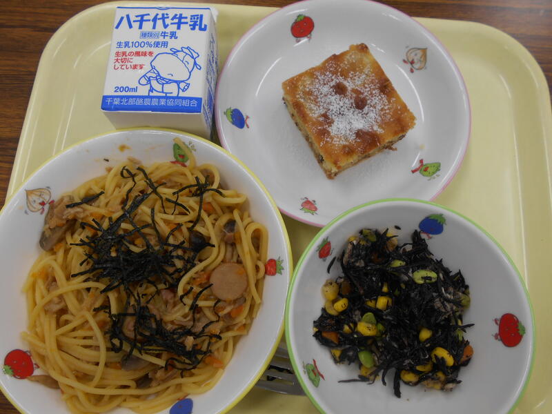 きのこスパゲッティ(のり) ささみとひじきのサラダ チョコチップケーキ 牛乳