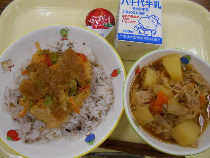 夏越ごはん(五穀米) 夏野菜のかき揚げ(おろしソース) ピリ辛肉じゃが 一口りんごゼリー 牛乳