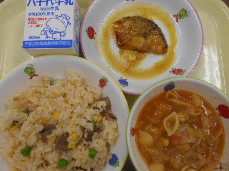 コーンピラフ  タンドリーフィッシュ  ミネストローネ  牛乳