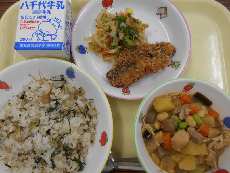 小松菜とシラスの混ぜご飯  イワシのオイスターソースフライ  キャベツのおかか和え  五目煮  牛乳