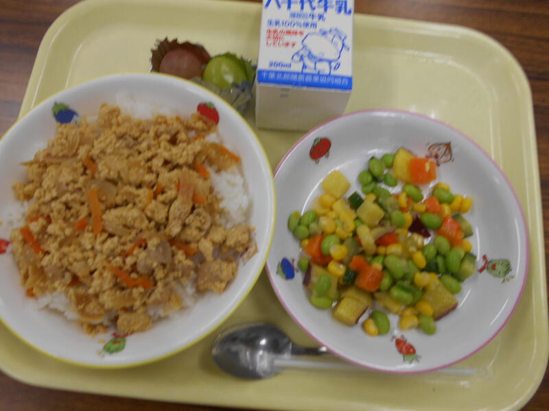 親子丼(ごはん)  さつまいもと枝豆のサラダ  ぶどう  牛乳