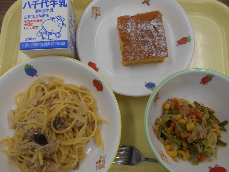 たらこときのこのスパゲティ  くきわかめツナサラダ  おからオレンジケーキ  牛乳