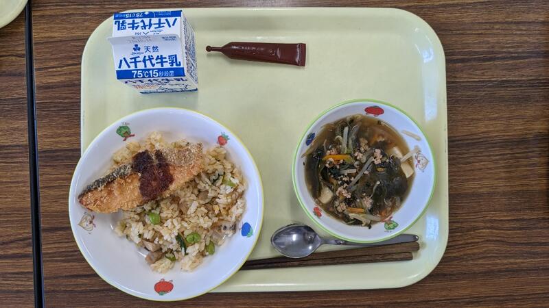 千葉にんじんチャーハン 鮭フライ 挽肉ともやしのスープ 牛乳(ミルメークココア)