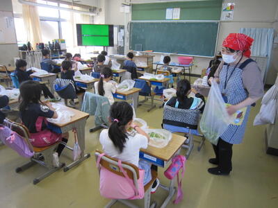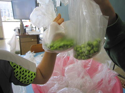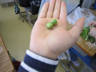 今日の給食「グリーンピースごはん」の食材にもなります。とても季節を感じる学習です。