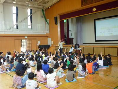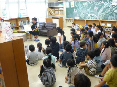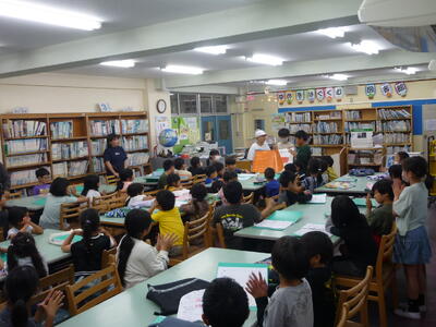 高学年の図書委員会さんから低学年のみんなへお昼休みに読み聞かせを行いました。