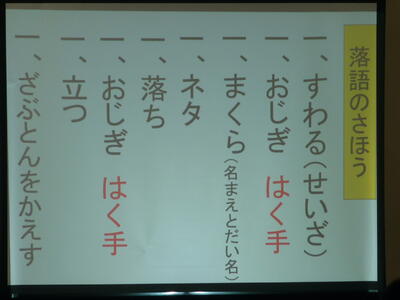 落語のマナーや言葉遊びによる「オチ」の楽しさを教えていただき、何人か子どもたちが落語にチャレンジして、良い経験をさせていただきました。