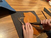 初めて使う「ひっかき刀」を使って、学校でデザインしたイラストを彫っていきます。