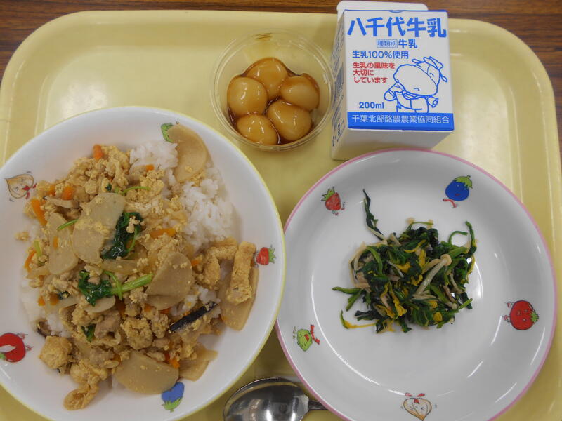 給食では、食べられる菊を入れたあえ物を作りました。香りやいろどりを楽しんでください。