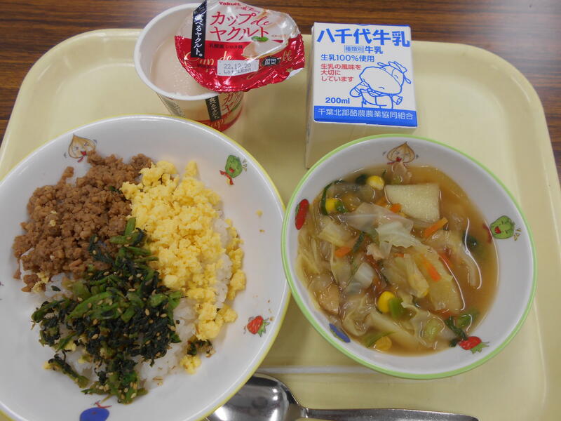 三食そぼろどんぶり(麦ごはん) キャベツスープ カップでヤクルト 牛乳
