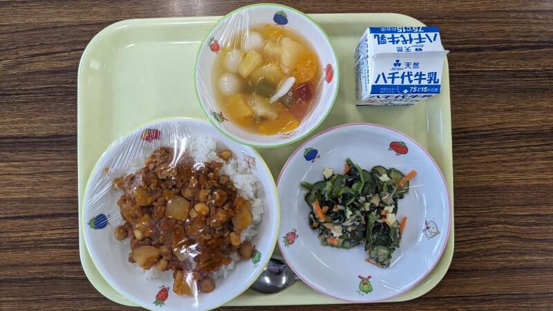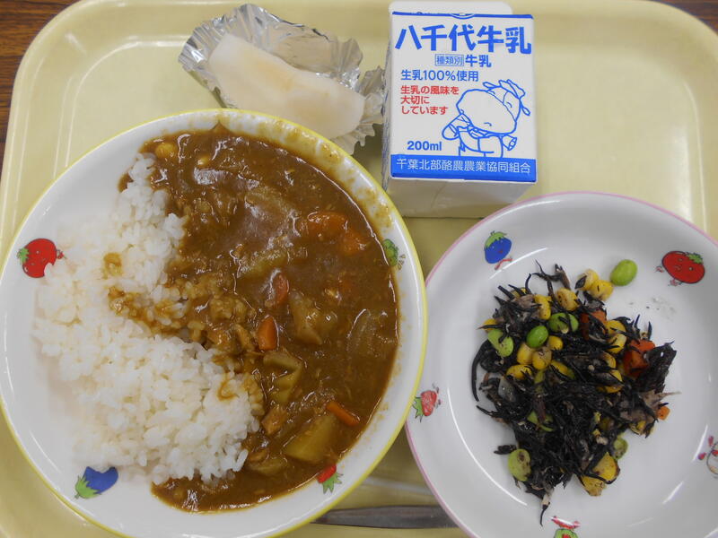 大豆とツナのカレー ごはん ささみとひじきのサラダ 市川の梨(豊水) 牛乳