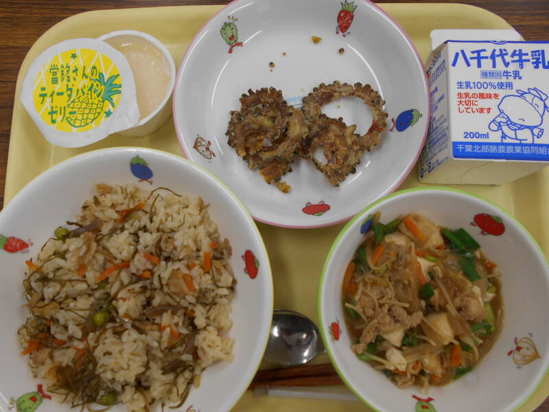 沖縄は、海藻・豚肉・豆腐・野菜を多く食べ、長生きの人が多いことで有名です。給食で沖縄県の炊き込みご飯、昆布と豚肉が入った「ジューシー」と「豆腐チャンプル」を作りました。チャンプルとは、沖縄の方言で「混ぜこぜにした」という意味があります。