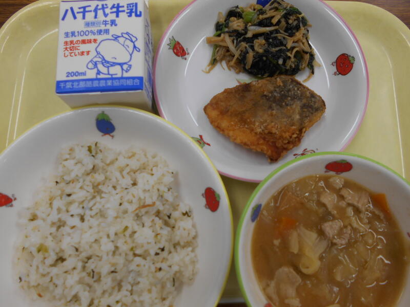 じゃこ入り菜飯 ほっけの塩こうじ漬け 梅いそ和え キャベツと生揚げの味噌汁 牛乳