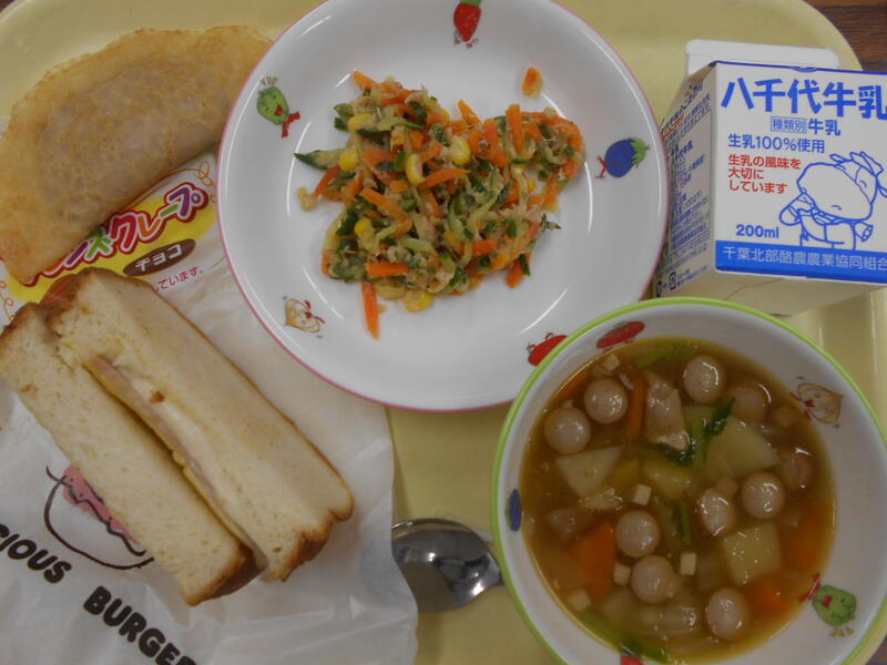 クロックムッシュ ひよこ豆入りポトフ ツナと人参のラぺ 米粉のクレープ(チョコ) 牛乳