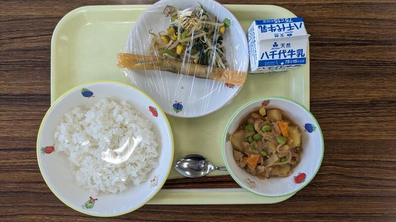 今日の「肉じゃが」はひとつで赤・黄・緑の食品がとれる栄養満点メニューです。給食はじゃがいもを使ったメニューが多いですが、使う量が一番多いのは「肉じゃが」です。小学校と中学校合わせて約96kgの北海道でとれたじゃがいもを使います。