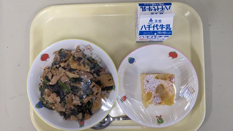 麦ごはん 小松菜と豚肉のあんかけどんの具 市川のなしケーキ 牛乳