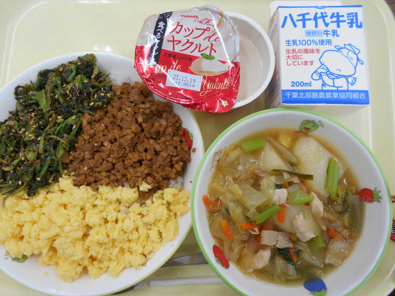 三食そぼろ丼(麦ごはん) キャベツスープ カップでヤクルト 牛乳