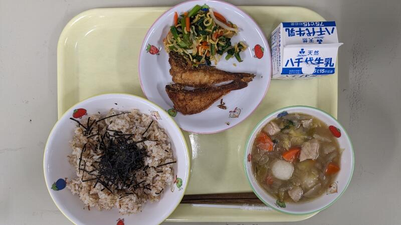 おかかごはん ハタハタのから揚げ 友禅和え だまこ汁 牛乳