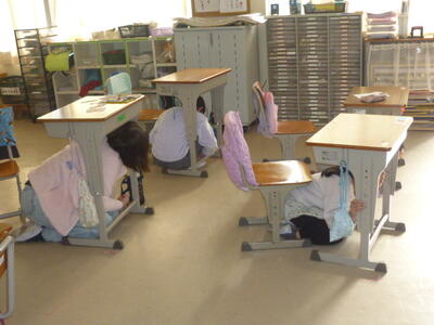 業間休み時間中に、子どもたちに事前の予告なしでの地震による避難訓練を行いました。