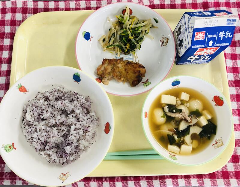 【今日の献立】むぎごはん あぶたまどんのぐ わかめスープ ぶどうゼリー 牛乳