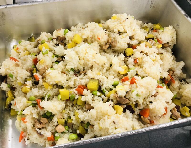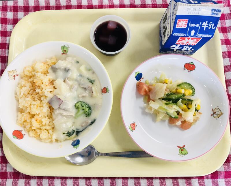【今日の献立】チキンピラフ カラフルサラダ コーンクラムチャウダー 牛乳