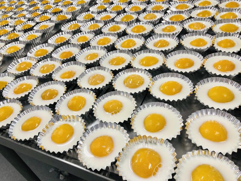 今日は目玉焼きそっくりなデザートが初登場です。目玉焼きの黄身の部分を桃で、白身の部分を牛乳寒天で表現しました。目玉焼きの見た目をしているのに甘い味でびっくりしている人もちらほら。