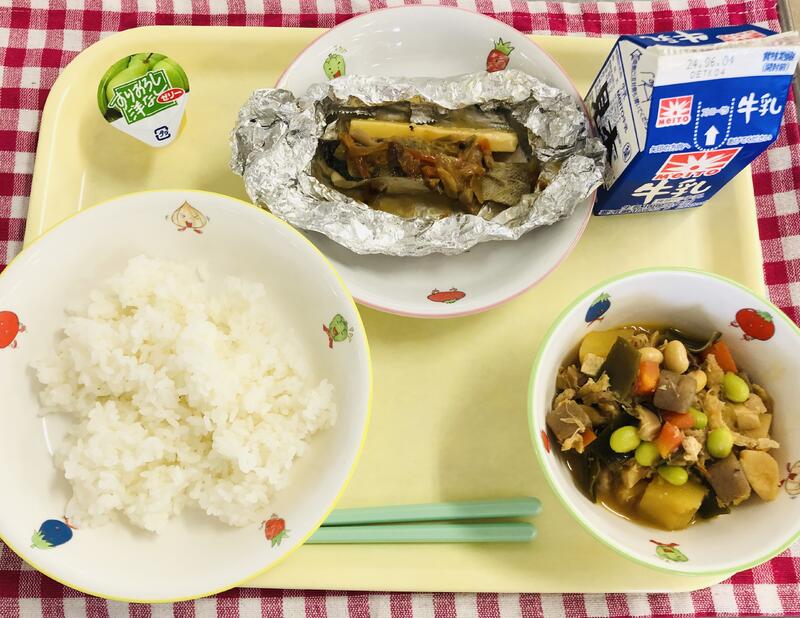 ごはん 牛乳 たらのちゃんちゃん焼き 五目煮 ひとくち洋なしゼリー