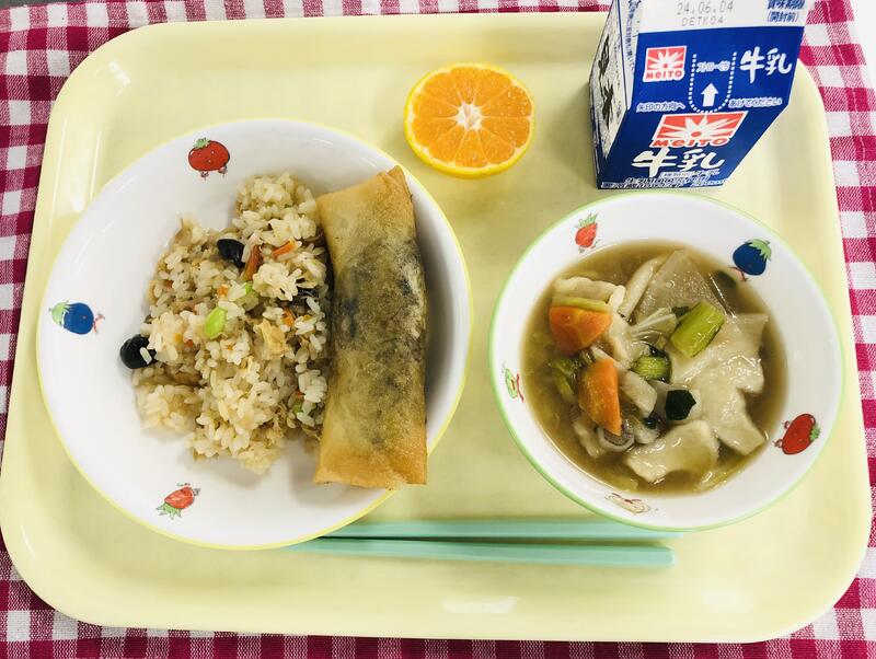 帆立とエリンギのごはん 牛乳 ひじき入り春巻き せんべい汁 花みかん