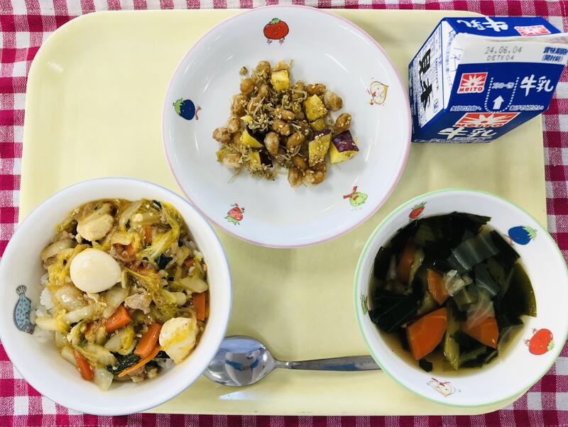 今日はお肉と野菜がたっぷりのホイコーロー丼です。さつまチップには黄色のさつまいもと紫色のさつまいもの2種類を使って、見た目も楽しい仕上がりにしました。陸上大会もあったので午前中にエネルギーをたくさん使った人も多いのではないでしょうか。しっかり食べてエネルギーをチャージしてくださいね。