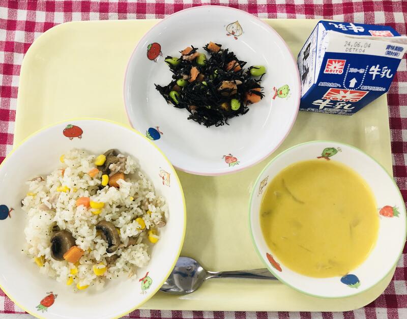 チキンピラフ・牛乳・ツナとひじきのサラダ・パンプキンポタージュ