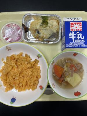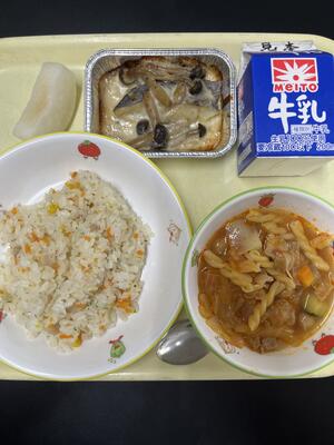 【今日の献立】コーンピラフ さかなのきのこソースやき ミネストローネ なし 牛乳
