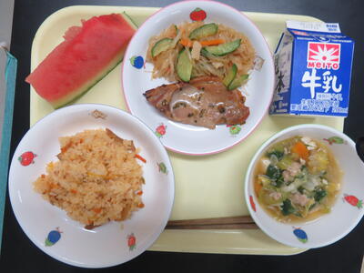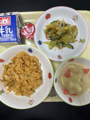 【今日の献立】チャーハン にくだんごもちごめむし とうみょうのちゅうかあえ わかめスープ 牛乳