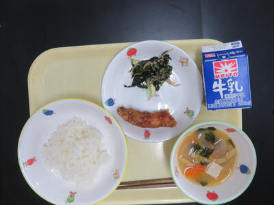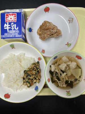 【今日の献立】ごはん とりのからあげ チーズなっとう えのきのみそしる 牛乳