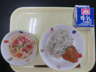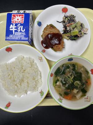 【今日の献立】あおのりしらすご飯 おろしハンバーグ トマトとたまごのスープ 牛乳