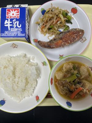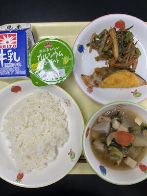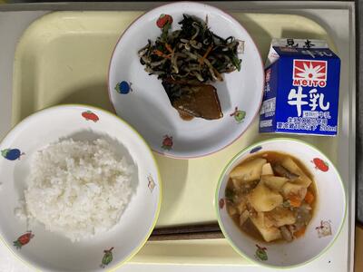 【今日の献立】ごはん さけのもみじやき くきわかめのきんぴら のっぺいじる ヨーグルト 牛乳