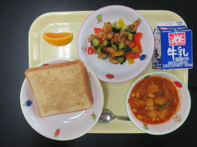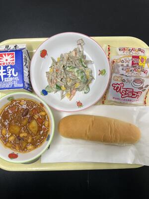 【今日の献立】はちみつパン チリコンカン ごぼうサラダ セレクトデザート 牛乳