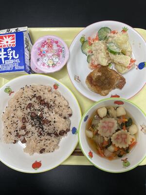 【今日の献立】せきはん とりにくのバーベキューソース ポテトサラダ おいわいすましじる おいわいゼリー 牛乳