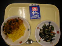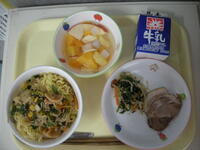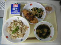 【給食の献立】ピリカラごぼうごはん たらのレモンソース あおなとツナのあえもの すましじる 牛乳