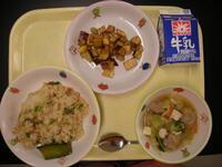 【今日の献立】チャーハン 肉団子スープ ミニ中華キュウリ キャラメルポテト 牛乳