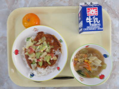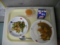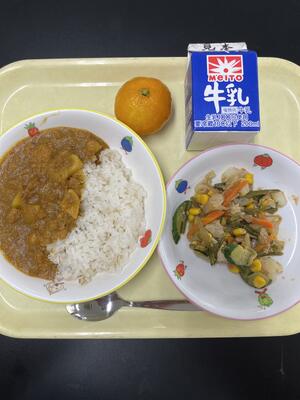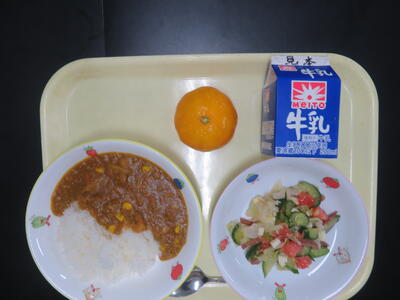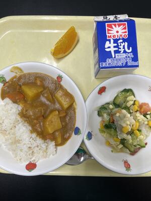 【今日の献立】むぎごはん チキンカレー イタリアンサラダ オレンジ 牛乳