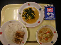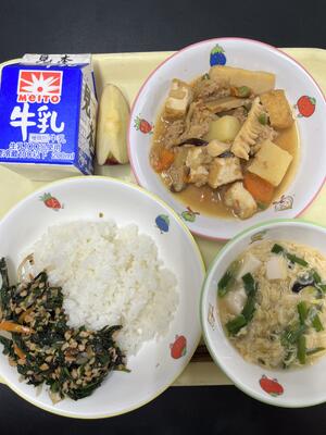 【今日の献立】ごはん さけのザンギ おかかあえ にくどうふ 牛乳