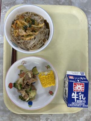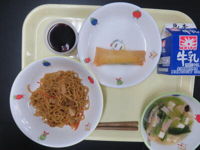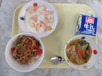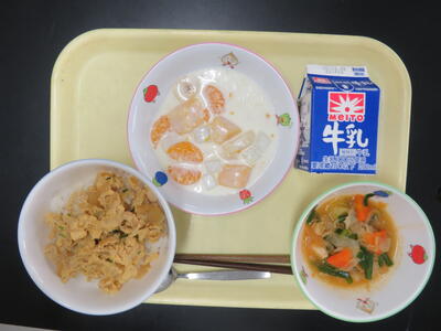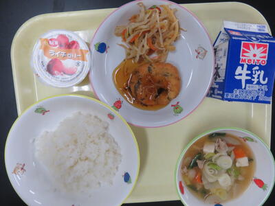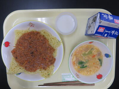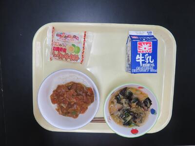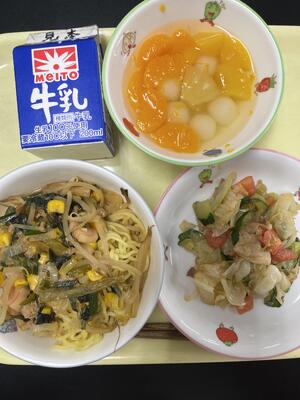 【給食の献立】みそラーメン やきにくサラダ フルーツしらたま 牛乳