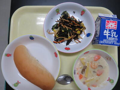 【今日の献立】コッペパン マカロニのクリームに パリパリひじきサラダ 牛乳