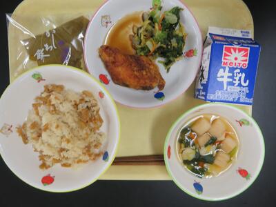 【今日の献立】筍ご飯 魚の竜田揚げ ごま和え すましじる 柏餅 牛乳