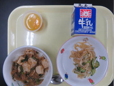 【今日の献立】麻婆豆腐 ごはん 切り干し大根の中華和え オレンジゼリー 牛乳