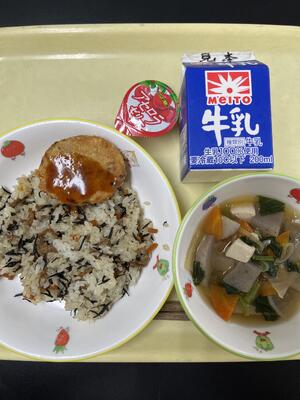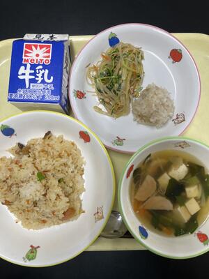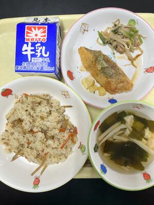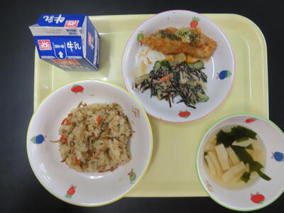 【今日の献立】ピリカラごぼうご飯 タラのレモンソース ひじきとツナのマヨあえ わかたけじる 牛乳