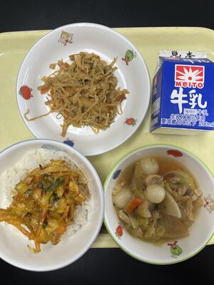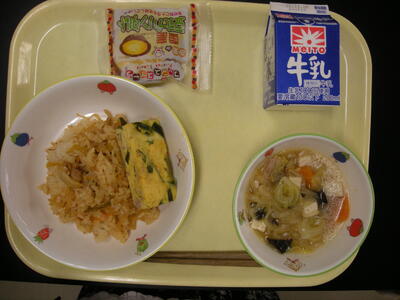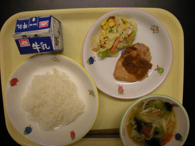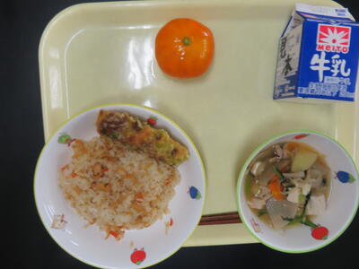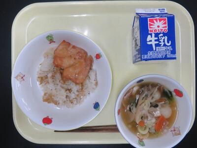 【今日の献立】ショウガごはん 鳥の照り焼き だまこじる 牛乳