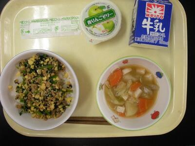 【今日の献立】三食そぼろ丼 八方味噌汁 青りんごゼリー 牛乳