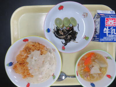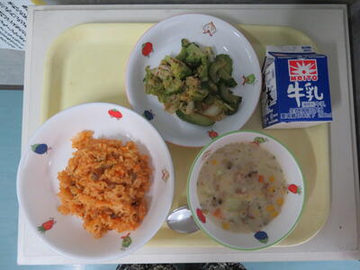 【今日の献立】ジャンバラヤ かぶととりにくのクリームに わふうサラダ ミニゼリー 牛乳